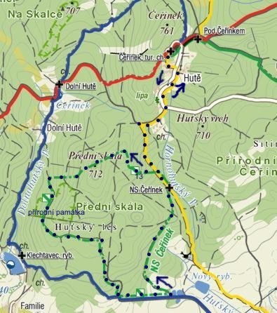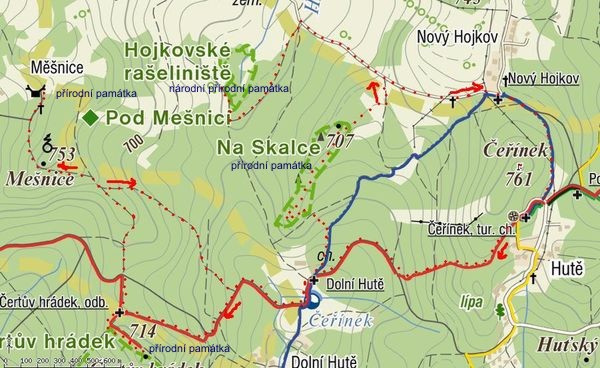 Sobotní trasa: chata na Čeřínku – po ČTZ Čertův hrádek – neznačenou cestou Mešnice – Pod Mešnicí – Dolní Hutě – Fialovy skály – Hojkovské rašeliniště – chata na Čeřínku = 18 km