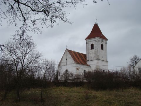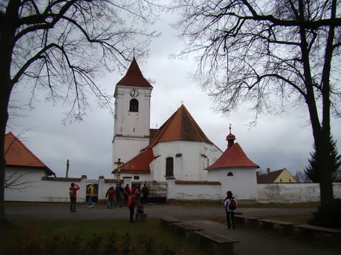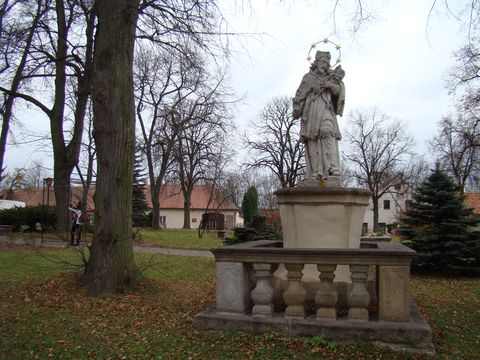Vyšlapali jsme do kopce ke kostelu, kde je přirozený střed vesnice, krásně upravený parčík zdobí socha sv. Jana Nepomuckého z roku 1729