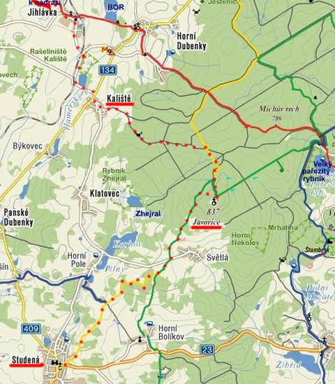 Trasa: Studená ŽTZ – za Vrškem přechod na ZTZ – Javořice – Studánka Páně – Kaliště – Jihlávka = 14 km