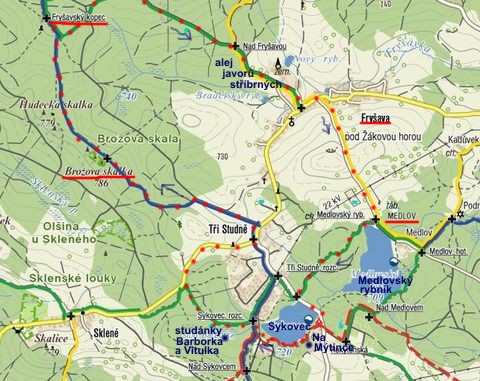 Trasa: Mýtinka – studánky u Sykovce – MTZ Brožova skalka – Fryšavský kopec – Nad Fryšavou – Fryšava ŽTZ – Medlov ZTZ – Tři Studně – Mýtinka = 16 km