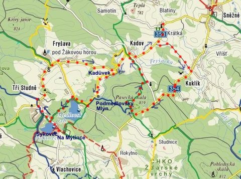 Trasa: Mýtinka – Tři Studně – Fryšava – Kadov – Krátká – Kuklík – Pasecká skála ZTZ – Kadov ŽTZ – Kadůvek – Podmedlovský Mlýn – Medlov ZTZ – Tři Studně – Mýtinka = 26 km