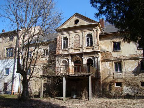 Asi jeden kilometr jsme sestupovali cestou do údolí k bývalým lázním, o nichž jsem psala nedávno. Mirek vyfotil tentokrát empírovou budovu lázní z druhé strany.
