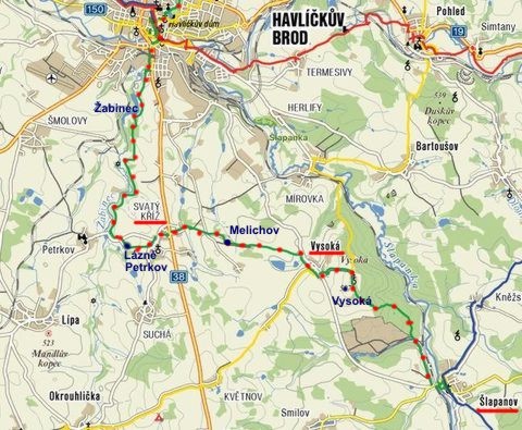 Trasa: Šlapanov ČD – Vysoká – Melichov – Svatý Kříž – lázně Petrkov – vodní nádrž Žabinec – Havlíčkův Brod = 13 km
