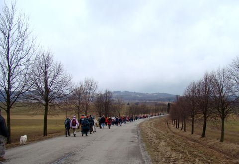 Z větrné silnice jsme záhy odbočili do lesa, který byl sametový, voňavý a laskavý, cesta poklidně plynula v příjemných hovorech, oči hledaly a hladily různé odstíny zelené barvy – a najednou, asi po čtyřech kilometrech spanilé procházky úsekem vyznačeným pro dnešní příležitost, jsme byli znovu na kraji lesa u křížku, kolem kterého jsme do lesa vstoupili. A to nás prosím šlo několik desítek, všichni v dohledu – pak že nejsou bludné kořeny… Přesně (ale pozdě) jsme si uvědomili, kde jsme kvůli ignoraci popisu trasy udělali chybu.