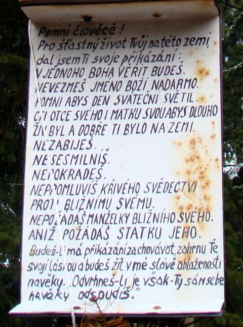 Poutník, který dojde na vrchol tajemného kopce a má dost trpělivosti nebo pádný důvod, může si přečíst zde zveřejněnou píseň La Salettskou, květnatě slibující sklíčené a plačící Panně Marii, která se 19. září 1846 zjevila pasačce Melanii Calvatové v La Salettě, aby jejím prostřednictvím varovala lidstvo před hněvem Božím, návrat k životu v pravdě a lásce… Svatá Panna si asi o slibech lidských myslí své… Pro ostatní je zde na kříži drobná tabulka s Desaterem – neuškodí přečíst si je: