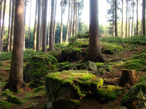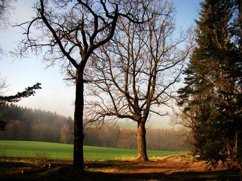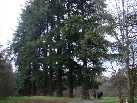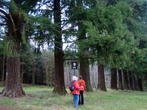 Vycházka tonula v radovánkách a než jsme se nadáli, byli jsme u třešťské hájenky a stejně jako vždycky jsme měli oči jen pro jedenáct nádherných douglasek tisolistých, stoletých dam, vysokých třicet metrů, některé s obvodem v pase přes tři metry. Musíte je vidět: