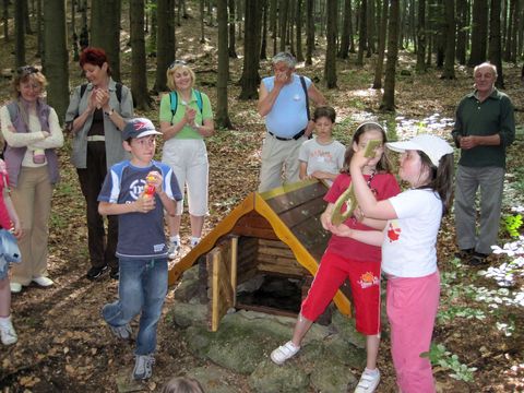Návštěva Hobzových kaštánků byla prologem svěžího odpoledne, v němž hrály studánky hlavní roli. Každý pramen odemkly děti zlatým klíčem, první se dočkala studánka Pod Kopulajem,