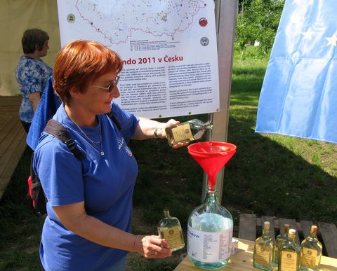 Do demižonku slévali zástupci oblastí vzorky vody, stejně jako právě činí Míla Bradová s vodou z řeky Jihlavy: