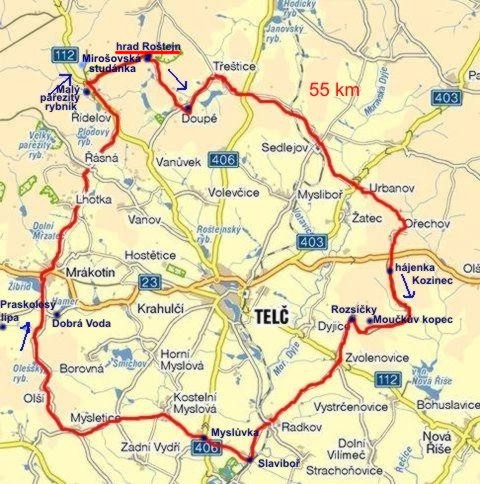 Trasa: Roštejn – Doupě – Třeštice – Sedlejov – Urbanov – Ořechov – hájenka Kozinec – Moučkův kopec – Zvolenovice – Radkov – Slaviboř – Myslůvka – Kostelní Myslová – Mysletice – Olší – Dobrá Voda – Praskolesy – Mrákotín – Lhotka – Řásná – Řídelov – Malý Pařezitý rybník – Mirošovská studánka – Roštejn = 55 km