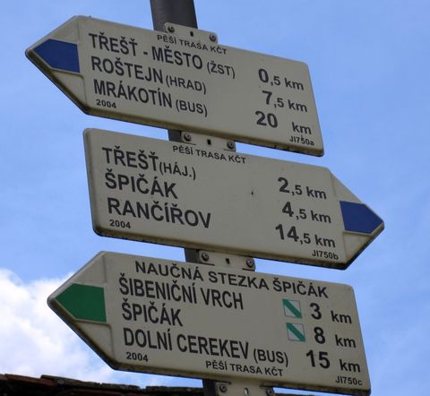 Jakmile jsme se dostli na hráz Váňovského rybníka, už zbývala jen část trasy, která vede městem Třeští. Naše značkařská práce na tomto úseku skončila u rozcestníku blízko autobusové zastávky na třešťském náměstí.