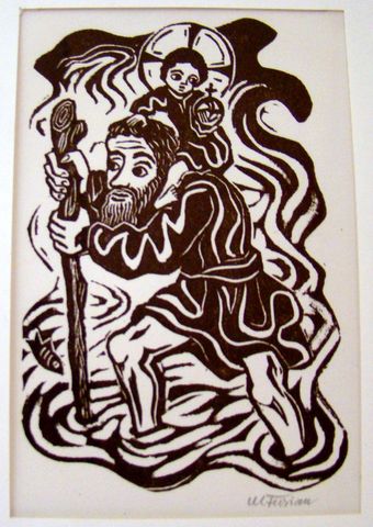 A nakonec půvabný obrázek patrona turistů a všech, kdož putují světem – svatý Kryštof s Ježíškem na ramenou a holí, která se užuž zazelená: