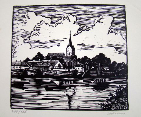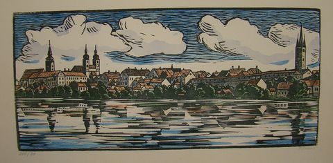 Staroměstský rybník s kostelem Matky Boží zachytil na svém grafickém listě Michael Florian.