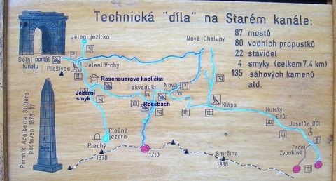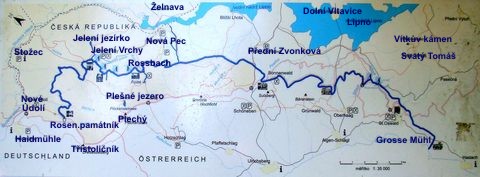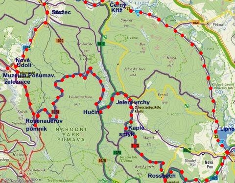 Trasa: Stožec – Nové Údolí – Rosenauerův památník a nádržka – podél Schwarzenberského kanálu k Hučině – Horní portál kanálu – Jelení Vrchy – Rosenauerova kaplička – Rossbach – Raškov – Nová Pec – podél Vltavského luhu k Černému Kříži – Stožec = 48 km