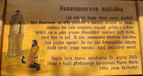 Pohled na temně hnědou rašelinnou vodu kanálu prosvícenou sluncem a tekoucí podle plánů páně Rosenauerových přesně tam, kam ji nasměroval, musí vzbudit obdiv k jeho představivosti a znalostem. Podél kanálu jsme pokračovali udržovanou cestou k Jezernímu smyku, kde je Rosenauerova kaplička.