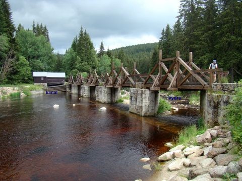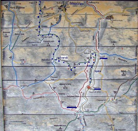 Ve stejném článku najdete povídání o Vchynicko-Tetovském kanálu, na jehož začátek jsme právě mířili – totiž k hradlovému mostu na Vydře, kde byly postaveny hrable, lidově zvané „rechle“, sloužící k zachycování volně plaveného dřeva a jeho přesměrování do kanálu, který obcházel nesplavný úsek řeky Vydry mezi Antýglem a Čeňkovou pilou. I tento kanál, 14,5 km dlouhý, vyprojektoval pro vlastníky panství Schwarzenberky jejich inženýr Josef Rosenauer. Kanál byl vybudován v letech 1799–1801 a umožňoval plavení dřeva z vysokých šumavských poloh do Otavy a dále do vnitrozemí. Dostatečný průtok vody byl jištěn plavebními nádržemi, zvanými klauzy, v nichž se nahromadila voda a po vypuštění splavila dřevo. Nádržek bylo asi osm (viz dnes často v kauze „kůrovec“ zmiňovaná nádrž na Ptačím potoce).