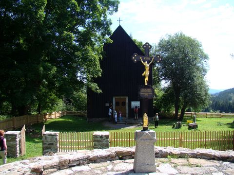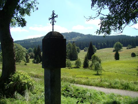 Střed zaniklé obce najdeme podle pomníku padlých z první světové války, místo kostela sv. Jana Křtitele nalezneme vysoký dřevěný kříž. Původní hřbitov byl v devadesátých letech zčásti obnoven, pro vnímavého člověka je procházka mezi starými náhrobky zdrojem otázek, z nichž jen ty základní, křesťanské, mají jasnou odpověď. Informace, které jsme se na místě dozvěděli od přátel i z vyvěšených cedulí, jsme postupně v mysli zpracovávali při jízdě silničkou přes Bučinu směrem na Kvildu. Bylo krásně a zanedlouho jsme se ocitli před sjezdem do Kvildy (1062 m). Nemohli jsme se nabažit pohledu na okolní svahy, které jsme naposledy viděli bílé a jiskřící v mrazivém lednovém slunci s pohybujícími se barevnými korálky lyžařů.