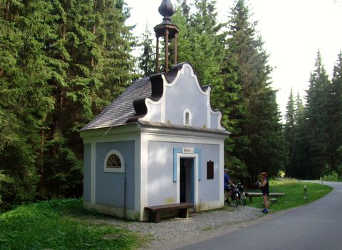 Cestu na Hůrku už jsme v obou směrech prošli pěšky i na lyžích, s kolem to byla premiéra. O smutném příběhu zdejšího místa jsem psala v dřívějších článcích o Šumavě, pro připomenutí zařazuji obrázek hůrecké kaple.