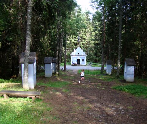 Odbočku k Hauswaldské kapli jsme neminuli, za chviličku jsme stáli na kopci ve výšce 930 metrů před základy, které tu zbyly po slavné poutní kapli na místě přezdívaném šumavské Lurdy. V roce 1820 byla zde postavena první kaple, protože sem s prosbami k Panně Marii putovalo množství lidí, a ta mnohé vyslyšela. Jsou popsána uzdravení léčivou vodou z místního pramene, pouť k Hauswaldské kapli byla velmi populární, lidé putovali zdaleka, až z Tyrol, prý. V roce 1957 kapli Panny Marie podminovali a odstřelili, zachovala se jen jedna soška, která je teď v srnském kostele, což je asi dva kilometry odtud. Místo v dřívějším vojenském prostoru chátralo, dokud občanské sdružení s názvem Karel Klostermann – spisovatel Šumavy neiniciovalo v roce 2006 jeho obnovu. Pramen byl z jeskyně, kde vyvěrá, přiveden k bývalé kapli ručně tesanými vantrokami, uloženými na 59 bludných kamenech, představujících korálky na růženci. Poslední, šedesátý, na nějž dopadá voda, je skleněný blok, který vytvořila Vladimíra Tesařová z Dobré Vody, autorka slavného skleněného oltáře v tamní kapli.