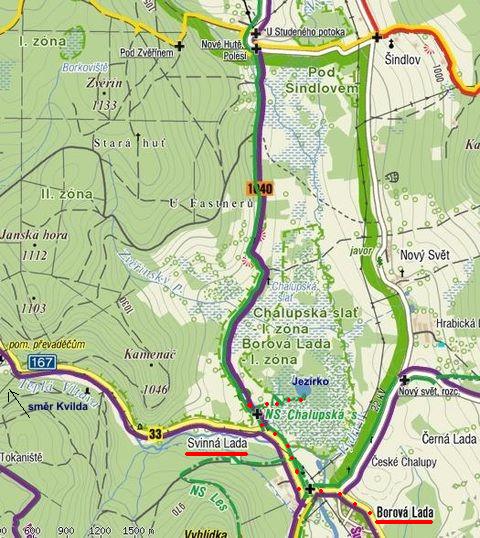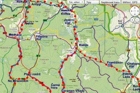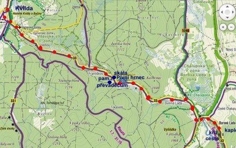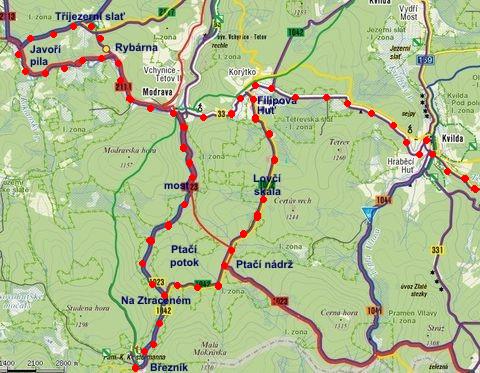 Sem zařadím i mapku trasy z Borových Lad na Kvildu, v jejímž okolí jsme se s průvodkyní pohybovali.