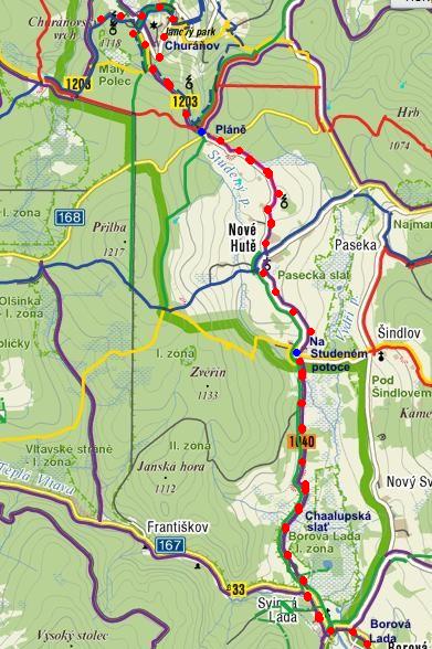 Trasa: Borová Lada – Svinná Lada – Nové Hutě – Pláně – Churáňov – Borová Lada = 25 km