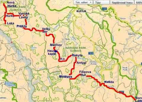 Nová Hůrka – Hůrka – jezero Laka – Hůrka – Vysoké Lávky – Prášily – Velký Bor – Mechov – podél Vchynicko-Tetovského kanálu – Hauswaldská kaple – Hakešická cesta – Rokyta – Antýgl – Rechle – Modrava – Filipova Huť – Korýtko – Kvilda – Borová Lada = 59 km