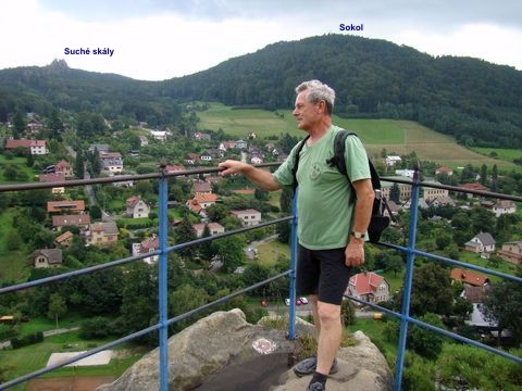 Když jsme u rozcestníku Pánovo pole přecházeli z červené na žlutě značenou stezku vedoucí na vrchol Sokola, začalo se skvostné ranní počasí přesně podle předpovědi kalit. Vyhlídku na Suché skály už jsme absolvovali v dešti, který sílil tak, že jsme se rádi uchýlili na krytou terasu zavřené hospody v Besedicích. Lilo v proudech asi hodinu, pak přišla hospodská a otevřela krám, čehož využili všichni zde shromáždění kromě nás – déšť se podstatně zmírnil, nebyl vítr, a tak jsme se sami vydali do skal. Dovedete si představit, jak nádherně tam bylo, když ani ne po deseti minutách déšť ustal zcela a sluníčko se hlásilo ke slovu?!