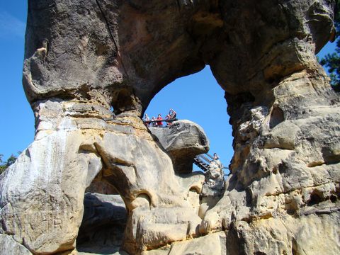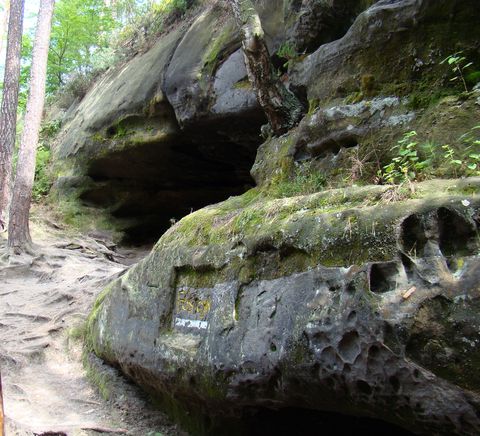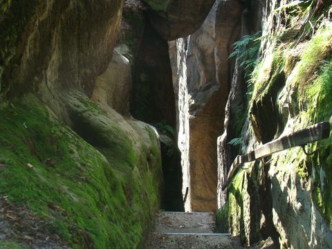 Většina této trasy je podrobně popsána ve článku z roku 2009, změna spočívala v tom, že jsme se za Studeným průchodem nevydali po ŽTZ do Olšiny, ale pokračovali jsme po ČTZ kolem restaurace Na krásné vyhlídce do Příhraz, kde na nás čekal autobus. Užili jsme si pověstné strmé schody vedoucí ke skalnímu městu a překonali s úspěchem i úsek, kde z nějakého důvodu část schodů chyběla.