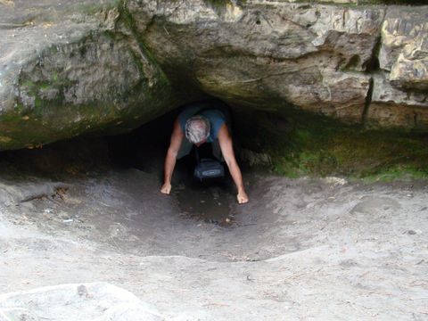 Ve velmi úzkém, dá se říci nepatrném vchodu (vlastně „vlezu“) do jeskyně se v prohlubni vytvořila po včerejším lijáku špinavá louže zvíci dvou metrů délky, kterou bylo třeba překonat v nedůstojné pozici „po čtyřech“ tak, aby se břicho ani kolena pokud možno nenamočila, ale vize, že vstoupíme do prostoru už před padesáti tisíci lety obývaného, byla vzrušující a nedbala malicherností. A byli jsme uvnitř!
