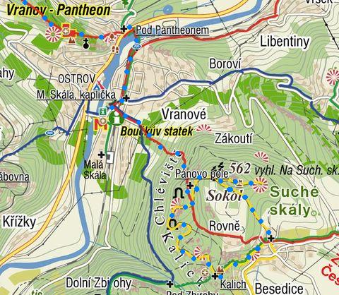 Trasa: Malá Skála ČTZ – Pánovo pole ŽTZ – Sokol – Besedice ČTZ, MTZ, ŽTZ – Kalich – Chléviště – Malá Skála – vyhlídka nad Jizerou – Vranov – Malá Skála = 15 km