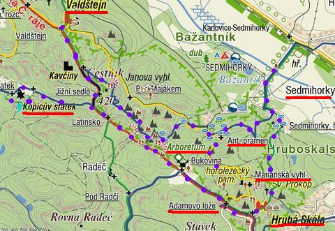 Trasa: Sedmihorky ZTZ – Hrubá Skála ČTZ – MTZ Kopicův statek – Valdštejn – MTZ – Sedmihorky = 15 km
