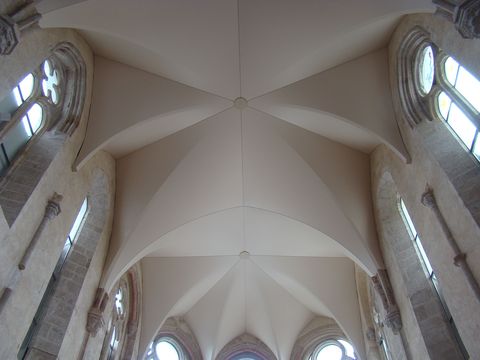 Při minulé prohlídce jsme viděli v presbytáři na rovném stropě, který zde byl zbudován místo původní zhroucené klenby, vsazené trámy. Ty byly během letních měsíců překryty unikátní klenbou, o níž řekl při slavnostním otevření Ing. arch. Martin Laštovička, jenž celou rekonstrukci kostela navrhl: