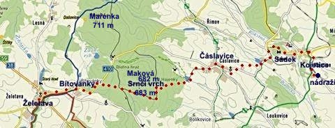 Trasa: Želetava – Bítovánky – pod Srnčím vrchem – Nový rybník – Čáslavice – Sádecký rybník – Sádek – Kojetice = 14 km