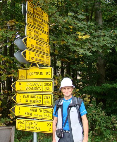 Je na čase představit našeho vedoucího Standu Balíka, zde je u cyklosměrovníku na rozcestí zvaném Vejpřahy, kam jsme se dostali z Korábu po ZTZ – Standa je totiž vedoucím cykloznačení v celé oblasti Vysočina, takže ho obří směrovník zaujal a potěšil (nás samozřejmě taky).