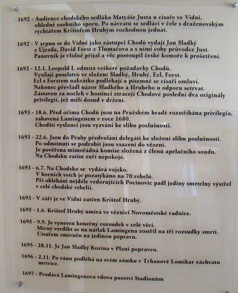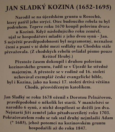 Pak jsme opustili žlutou značku, abychom se po dvou kilometrech protrpěných na frekventované silnici dostali polní cestou do Újezda, nejslavnější z jedenácti chodských obcí, kde bylo v letech 1692–1695 centrum povstání Chodů. Obce byly založeny panovníkem ku ochraně hranic Českého království (písemná zpráva o tom je ze začátku 14. století) a obyvatelé získali četná privilegia, která jim později byla vrchností upírána. Nejznámější je jejich odpor proti majiteli panství Lomikarovi (Wolf Maxmilián z Lamingenu) z Trhanovského zámku, který skončil v roce 1695 popravou Jana Sladkého Koziny v Plzni.