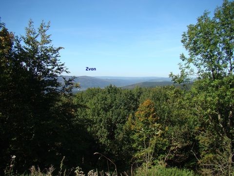 a z místa, kde pravděpodobně býval palác, obdivujeme v dálce vrch Zvon, z jehož rozhledny jsme se na začátku února 2009 toužebně dívali na jižnější část Čerchovského lesa, kudy právě v těchto dnech putujeme.