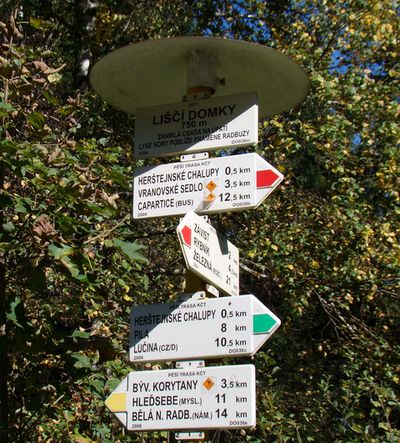 Nedá se říci, že by cesta po hřebeni byla málo členitá, to jsme si uvědomili, když jsme sestupovali ze Starého Herštejna a procházeli jsme místy, kde bývaly vesnice, nyní zcela zaniklé. Na rozcestníku u bývalých Liščích Domků je dobře vidět naše poloha; odtud jsme se rozhodli zajít k prameni Radbuzy. Velice nás lákalo vidět to místo beze sněhu – můžeme porovnat fotografie, které Mirek pořídil při Zimním srazu turistů v Bělé nad Radbuzou, který se konal v roce 2009.