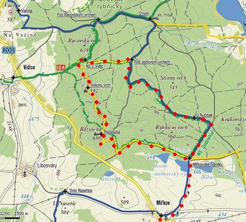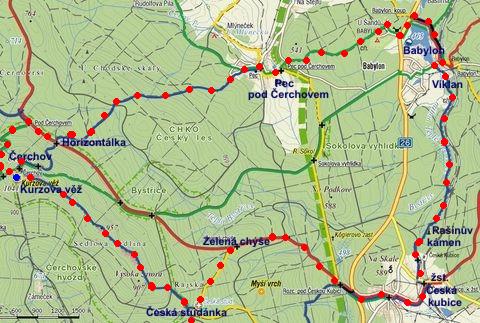 Trasa: Pec – koupaliště Babylon – viklan – Rašínův kámen – Česká Kubice – Zelená chýše – Česká studánka – Čerchov – rozcestí pod Čerchovem – Horizontálka – Pecácká cesta – Pec = 20 km (asi víc)