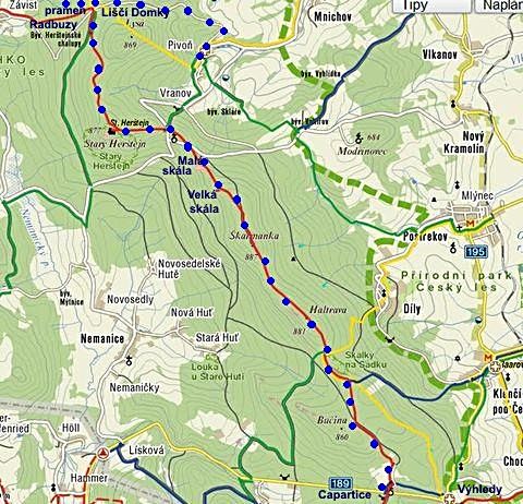 Trasa v pátek 30. září 2011: Capartice – Sádek – Haltrava – Škarmanka – Velká skála – Vranovské sedlo – Starý Herštejn – Herštejnské Chalupy – Liščí Domky – pramen Radbuzy – Liščí Domky – Pivoň = 20 km