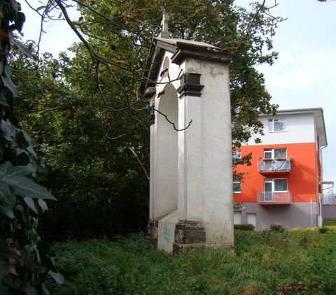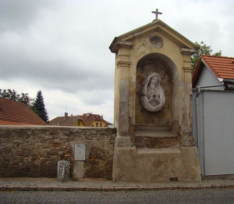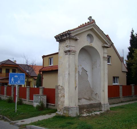 5. Dovolte, abych Vás upozornila na ještě jednu kapliču, schovanou „za rohem“ na křižovatce na Vrábí. Nalézá se mezi dřevěnou zábranou Průmyslové ulice a elektroservisem Rodových a je volně přístupná.