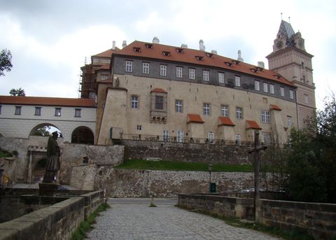Na místě, kde je nyní zámek, stávala u mostu přes Labe už na začátku 14. století tvrz, v 15. století z ní udělali hrad, ten pak přestavěli do renesanční zámecké krásy. Posledním šlechtickým majitelem byl císařský pár Karel I. a Zita. (Císař Karel byl v roce 2004 Janem Pavlem II. blahoslaven a papež vyhlásil 21. říjen, den jejich svatby /1911/, jejich společné cesty do nebe, jeho svátkem. Karel při sňatku /to je doloženo/ řekl své nevěstě: Nyní si musíme vzájemně pomoci do nebe!) V roce 1919 byl zámek zabrán státem, od roku 1995 je v majetku města.