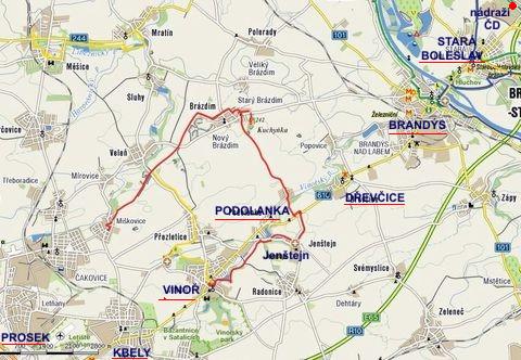 Trasa: Prosek – Kbely – Vinoř – Podolanka – Dřevčice – Brandýs nad Labem – Stará Boleslav – nádraží ČD = 23 km
