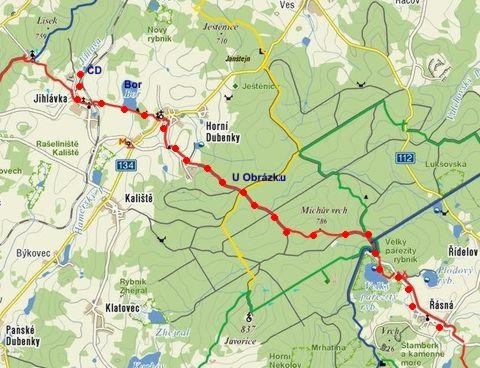 Trasa: Řásná – Velký Pařezitý rybník – U Obrázku – Janštejn – Horní Dubenky – Bor – Jihlávka – ČD Jihlávka = 12 km