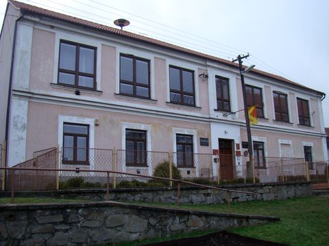 Přijeli jsme na tichou náves v Martínkově a všechny objekty našeho zájmu jsme měli hned na očích – pomník Václava Kosmáka, starou školu i kostel.