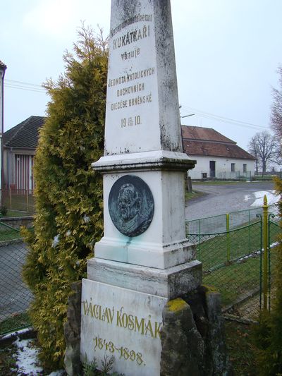 O Václavu Kosmákovi (1843–1898), knězi a spisovateli, rodáku z Martínkova, jsem psala dosti podrobně ve článku Novoroční výstup na Šacberk 2011, protože tento pozdější skvělý fejetonista – sám si říkal „kukátkář“ – podle tehdejší atrakce (prohlížení pohyblivých obrázků průzorem), se kterou po venkově tehdy cestovali tzv. kukátkáři, studoval v Jihlavě a podal své literární svědectví o majálesu a prvním pěveckém provedení hymny v roce 1859 na Šacberku. Byl člověkem velmi váženým, o tom svědčí pomník, který zde nechala postavit Jednota katolických duchovních v roce 1910.