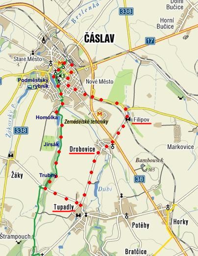 Putování bylo nenáročné, po kratičké prohlídce centra Čáslavi jsme vyšli po ZTZ k Tupadlům a odtud neznačenými cestami přes Drobovice a Filipov zpět, celkem to bylo 14 kilometrů. Podívejte se na mapku: