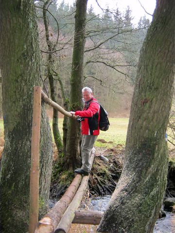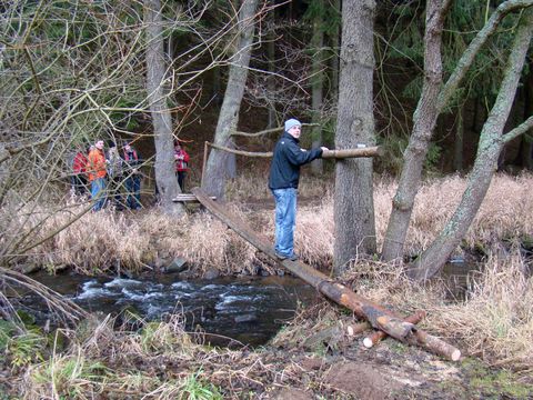 Během vycházky jsme si užili i trochu turistického folklóru, když jsme přecházeli na druhý břeh Brtničky po nově zbudované lávce z otesaných kmenů.