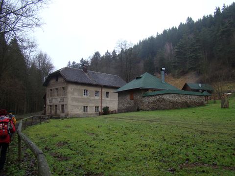 U mlýna jsme opustili modrou značku, po níž jsme sem přišli z Rokštejna, a vystoupali jsme svahem vzhůru na hranu údolí, odkud je už zase útěšný výhled na areál mlýna, který převzali původní vlastníci naprosto zdevastovaný.