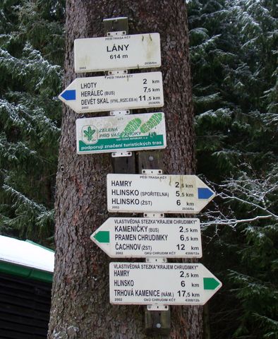V Hamrech jsme lehce nalezli zelenou TZ, která vede až k prameni. První zastavení bylo v osadě Lány před rozcestníkem.