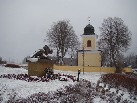 Sněhové přeháňky milosrdně ustaly, když jsme přišli do Kameniček a toužili si vyfotit místa turisticky atraktivní. K nim patří kostel Nejsvětější Trojice, v jehož blízkosti je památník obětem války, rané dílo sochaře Karla Lidického, rodáka z Hlinska