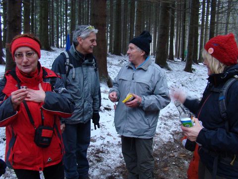 a cupali chutě stejnou cestou nazpátek. Požili jsme, a tak jsme se chovali rozverně a rozpustile, což nám vydrželo, i když občasné sněhánky přešly v hustou metelici s mohutným větrem. Ale všechno trvá, až se ztrhá – k autu do Hamrů jsme přišli se setměním, ale za slušného počasí.